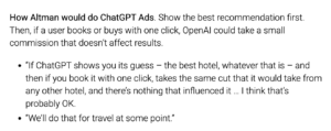 “If ChatGPT were accepting payment to put a worse hotel above a better hotel, that’s probably catastrophic for your relationship with ChatGPT.”